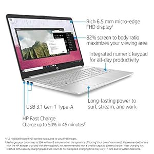 Stay connected to what matters most with long-lasting battery life and thin and portable, micro-edge bezel design. Built to keep you productive and entertained from anywhere, the HP 15 diagonal laptop features reliable performance and an expansive display, letting you stream, surf and speed through tasks from sun up to sundown. HP notebooks make it easy for you to do more and stay connected, all with affordable pricing and worry-free computing experience that’s just right for you. Discover the perfect balance of performance and appearance. With its thin and light design, 6.5 mm micro-edge bezel display, with its 82% screen to body ratio. Take this PC anywhere and see and do more. By squeezing a larger screen into a smaller frame, this ultra-thin, barely visible bezel revolutionizes your display’s appearance with a beautifully efficient design. Powerful enough for your busiest days, this PC features a powerful 10th Generation Intel i5 processor and speedy SSD storage at a great value. Using the Intel UHD Graphics smoothly stream 4K content and play your favorite games. With long battery life and fast-charge technology, this laptop lets you work, watch, and stay connected all day. Enjoy a smoother wireless experience with Wi-Fi 6 (2×2) and Bluetooth® 5.0 combo, all your connections are solid and up to 3x faster file transfer speeds than Wi-Fi 5. Pair with an MU-MIMO router for a smoother online experience in multidevice homes. Integrated precision touchpad with multi-touch support speeds up both navigation and productivity. Easily take this thin and light PC from room to room or on the road. When your PC goes wherever you go, staying productive and entertained has never been easier. With two microphones and advanced noise reduction software, you’ll always sound crystal clear when you video chat or record with the HP TrueVision HD webcam. When your laptop is low on power, no one has time to wait for hours to recharge. Power down your device and go from 0 to 50% charge in approximately 45 minutes.