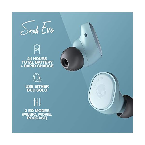 “With up to 24 hours of total battery life and a complete yet simple set of controls, Sesh Evo is the easiest way go truly wireless. For example, the buds automatically enter pairing mode the first time they power on. And after that, they’ll instantly pair with the last device you used. Likewise, you can adjust volume, skip tracks, take calls, activate an assistant and even select different EQ modes—all with a single finger, and without ever touching your phone. Sesh Evo earbuds are water, sweat and dust resistant. Built-in Tile technology helps you find your buds if you misplace them. And with the Skullcandy Fearless Use Promise, if anything ever happens to a bud or the case, you can replace it at a discount”.