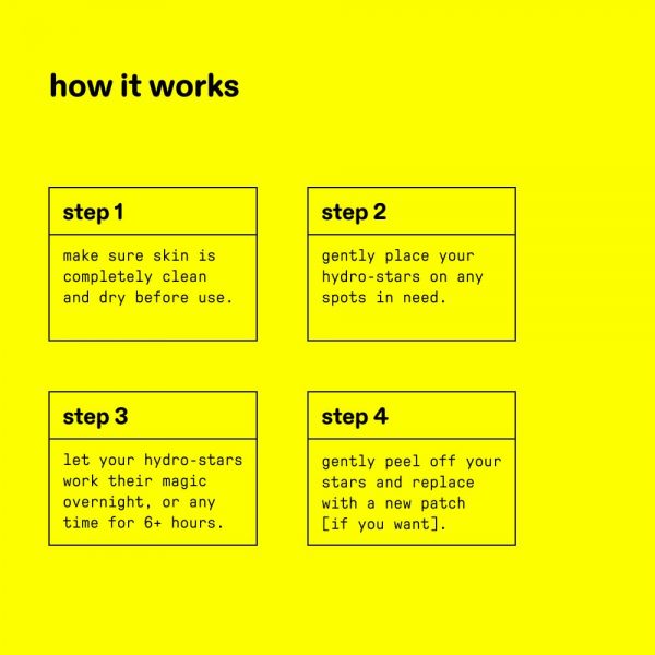 A SINGLE INGREDIENT: Hydro-Stars have only one ingredient: hydrocolloid, a substance borrowed from surgical dressing that’s clinically proven to improve the appearance of pimples overnight.